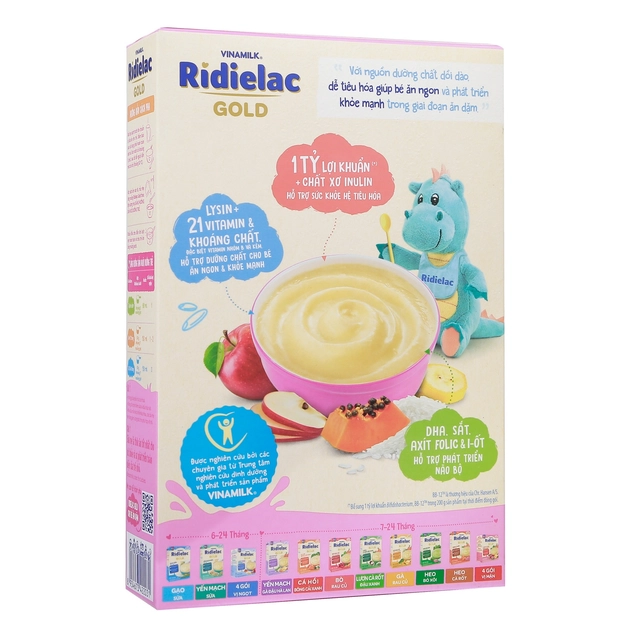 Bột ăn dặm Ridielac Gold là sản phẩm của Công ty Cổ phần Sữa Việt Nam Vinamilk, thương hiệu hàng đầu Việt Nam về các sản phẩm dinh dưỡng và sức khỏe phục vụ cộng đồng. Bên cạnh bột ăn dặm, Vinamilk còn cung cấp các sản phẩm dinh dưỡng khác cho sự phát triển của bé như bánh ăn dặm, sữa công thức, sữa bột.